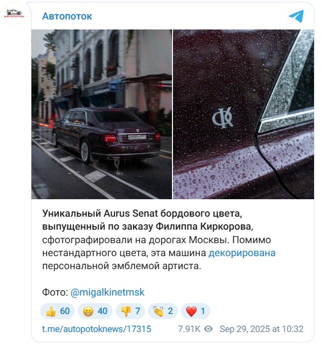 На дорогах столицы вновь появился повод для бурных обсуждений среди автомобилистов. В объективы камер попал совершенно особенный Aurus Senat, который, как известно, принадлежит королю российской эстрады Филиппу Киркорову. Этот экземпляр сложно спутать с каким-либо другим: его кузов окрашен в глубокий, насыщенный вишневый оттенок, который не встретишь в стандартной палитре. Дополнительным штрихом, подчеркивающим статус владельца, служит персональный герб артиста, нанесенный на кузов.