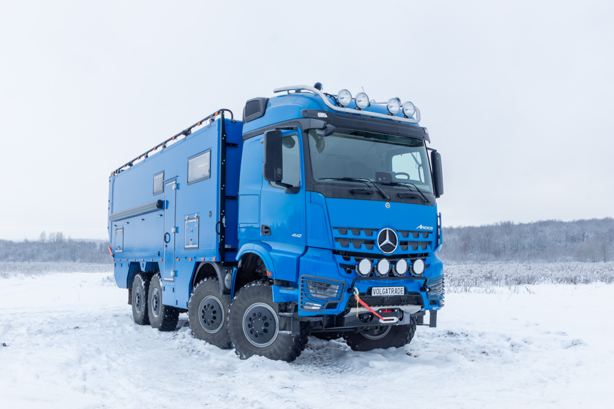 Фото: kung.ruАвтодом отличается высокой автономностью и технологичностью. Mercedes Arocs получил увеличенный топливный бак на 550 литров, подогрев топливной системы, мощную лебедку и дополнительное освещение. Для комфорта есть пневмоподвеска кресел, а для активного отдыха — внешняя насосная станция, летняя кухня с грилем и вместительные багажные отсеки, вплоть до места для мотоцикла.