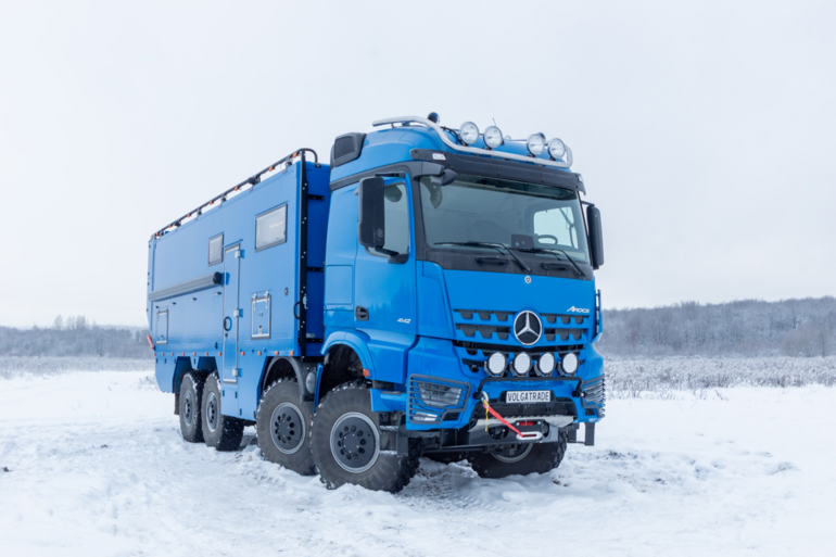 Семейные путешествия по России сегодня предлагают проекты, способные удивить даже искушенных автотуристов. Яркий пример — экспедиционный автодом на базе Mercedes Arocs 8х8. Это настоящий дом на колесах для жизни в суровых условиях, с брутальным фургоном длиной 7,45 метра. Внутри — шесть спальных мест, просторная гостиная, полноценная кухня и мастер-спальня, отделанные натуральным шпоном и влагостойкой фанерой. Санузел оборудован душевой с парогенератором.