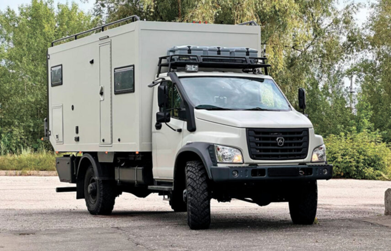 Кабина оборудована видеорегистратором, планшетом, радиостанцией и кондиционером. Эргономика выполнена в стиле «Газели», кресла регулируются, а для связи между кабиной и салоном предусмотрено переговорное устройство. Внутри автодома – гостиная с посадкой на 2–4 человека, складной стол и дополнительное спальное место для гостей. Для развлечений установлен телевизор с Android и доступ к онлайн-сервисам.