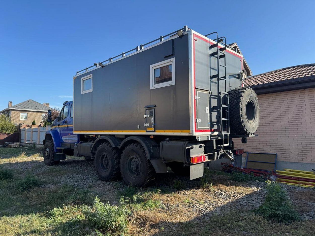 Внедорожные возможности машины подключают сразу две лебедки: механическую заднюю на 7 тонн и электрическую боковую на 9 тонн. Для удобства доступа на крышу установлены ограждение и лестница, светодиодная балка-люстра на кабине обеспечивает видимость в темное время суток. Под рамой размещен выдвижной ящик для генератора, а в кабине установлен кондиционер и автономный обогреватель Планар 4Д, что особенно актуально для дальних поездок в любое время года. Для защиты от солнца и воды предусмотрена маркировка.